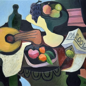 Size L | Still life with mandolin, fruit and newspaper (2025)